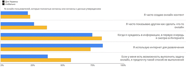 Поведение украинцев в Интернете совпадает с глобальными тенденциями. Так, украинские онлайн-пользователи в первую очередь развлекаются (82%), ищут в Интернете информацию (74%) и выполняют поставленные задачи онлайн (38%), а также размещают онлайн-контент (22%), помогают другим, показывая, как что-то сделать онлайн (27%).