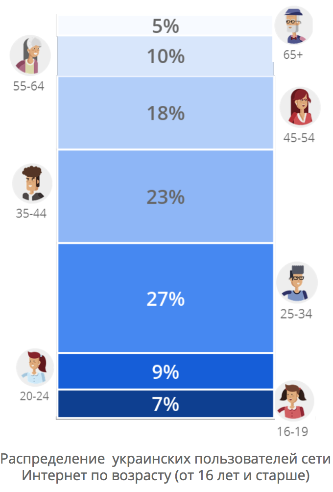 Исследование показало, что 66% украинцев регулярно пользуются Интернетом для личных целей (на глобальном уровне эта цифра составляет 82%). Самые активные пользователи – в возрасте 25-34 и 35-44 лет (27% и 23% соответственно). Однако, вопреки предположениям про молодой возраст онлайн-пользователей, распределение использования Интернета по возрастным группам достаточно равномерно. Интернет ‒ это среда, которая позволяет общаться людям любого возраста.