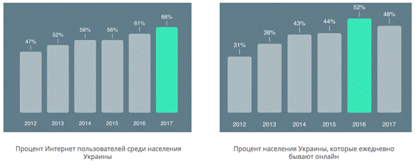 Все больше украинцев выбирают смартфон для пользования Интернетом. Так, в 2017 году 18% пользователей одинаково часто использовали как компьютер/планшет, так и смартфон для выхода в Интернет, а для 28% предпочитаемым устройством для выхода в сеть является смартфон.