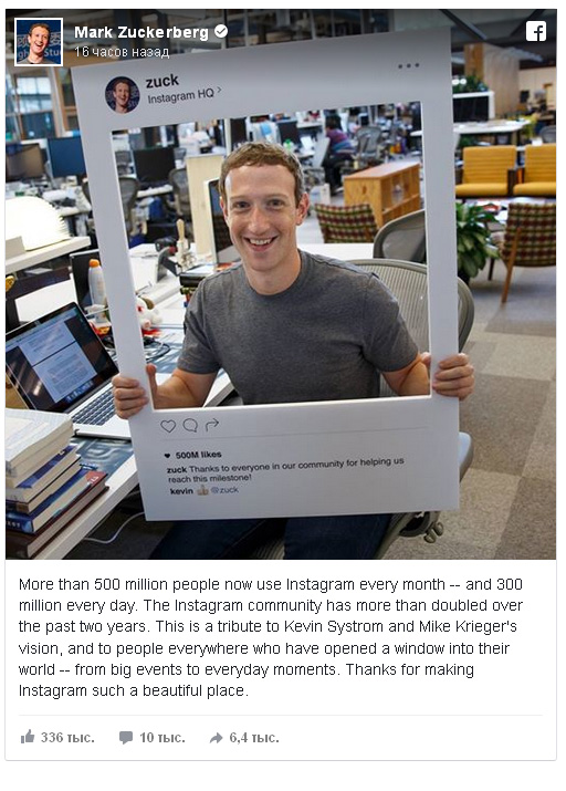 «Более 500 миллионов человек используют Instagram ежемесячно, а около 300 миллионов человек — каждый день. За последние два года количество пользователей Instagram выросло более чем в два раза. Я хочу отдать должное Кевину Систрому и Майку Кригеру, а также всем людям, которые открыли окно в свой мир и показали как важные события, так и повседневные зарисовки. Спасибо, что делаете Instagram таким замечательным местом».