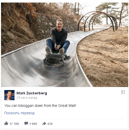 В марте 2016-го Цукерберг вызвал неоднозначную реакцию в соцсетях постом с фотографией своей утренней пробежки по Пекину. В подписи к снимку глава Facebook сообщил, что рад вернуться в Китай. В комментариях к записи пользователи задались вопросом о том, как Цукерберг смог опубликовать фотографию в Facebook, если на территории страны социальная сеть заблокирована.