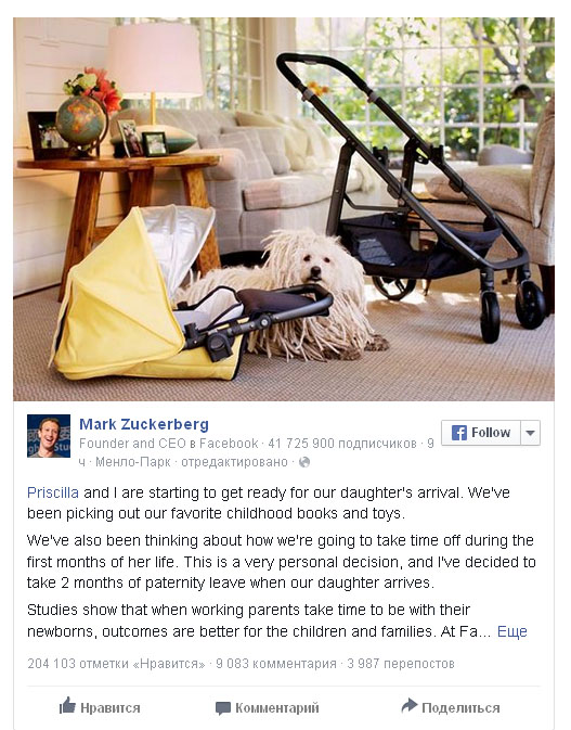 «Это очень личное решение, и я решил взять двухмесячный отпуск по уходу за ребенком», — написал Цукерберг. Он привел в пример результаты исследований, согласно которым временный уход родителей с работы после рождения ребенка оказывает положительное влияние на семью в целом.