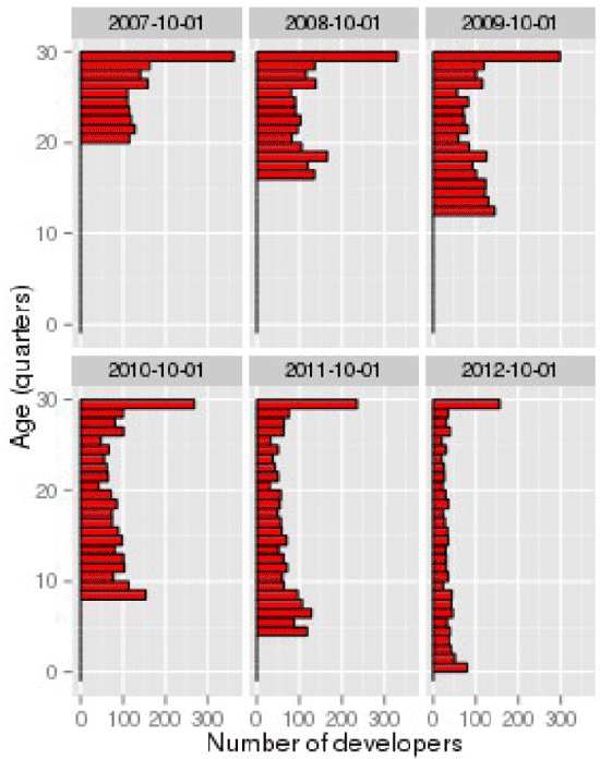 Конечно, статистика не дает возможности определить физический возраст разработчиков. Под «возрастом» в этом исследовании подразумевается время участия в проекте, исходя из количества трехмесячных интервалов. Соответственно, и «демография», и «уход на пенсию» изучаются не с точки зрения физического возраста, а исходя из времени работы над проектом. Под новыми «поколениями» имеются в виду разработчики, которые присоединились к проекту примерно за один и тот же трехмесячный период.