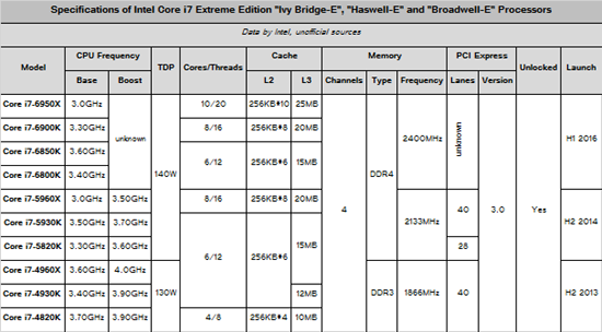 Спецификации процессоров Intel Broadwell-E и предшественников