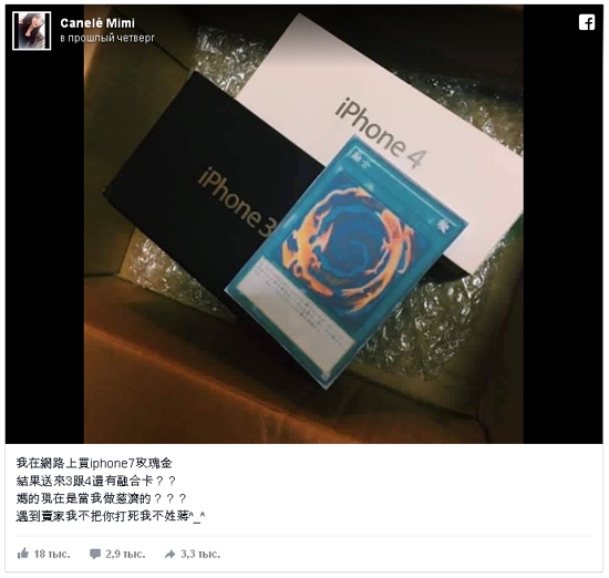 Жительница Тайваня по имени Мими Цзянь стала новой интернет-звездой, после того как поделилась на своей странице в Facebook фотографией iPhone 3G и iPhone 4, которые она получила вместо заказанного iPhone 7. На неудачливую покупательницу обратил внимание сайт The Daily Dot.