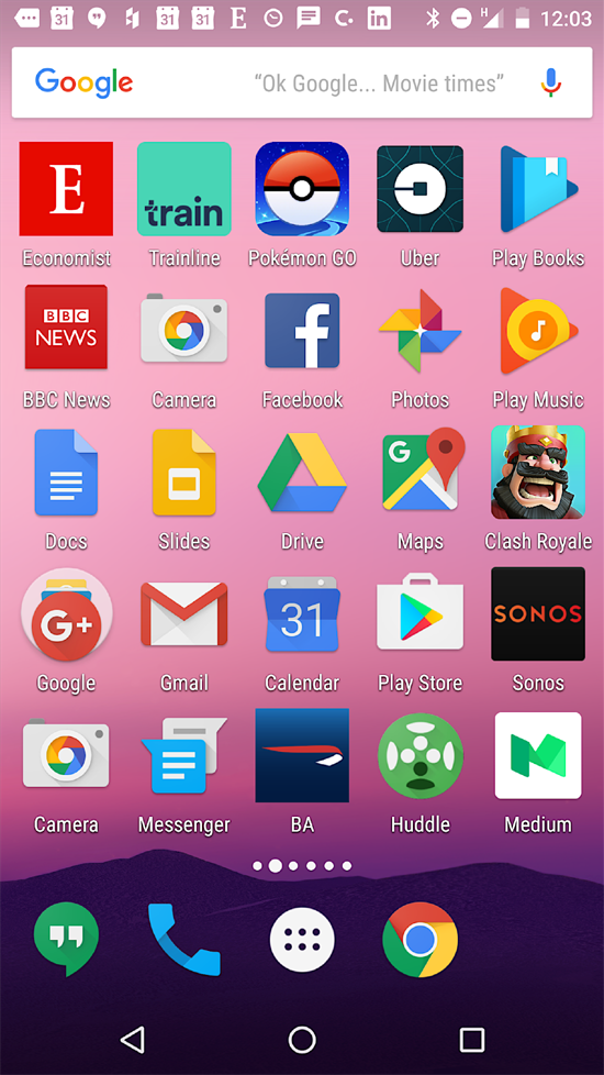 На экране также размещается папка с фирменными приложениями Google: соцсеть Google Plus, Gmail, календарь Play Store. Еще есть утилита управления динамиками Sonos, Messenger, приложение от British Airways, утилита организации встреч Huddle, блогерское приложение сайта Medium, мессенджер Google Hangouts, стандартный телефон Android, браузер Google Chrome.