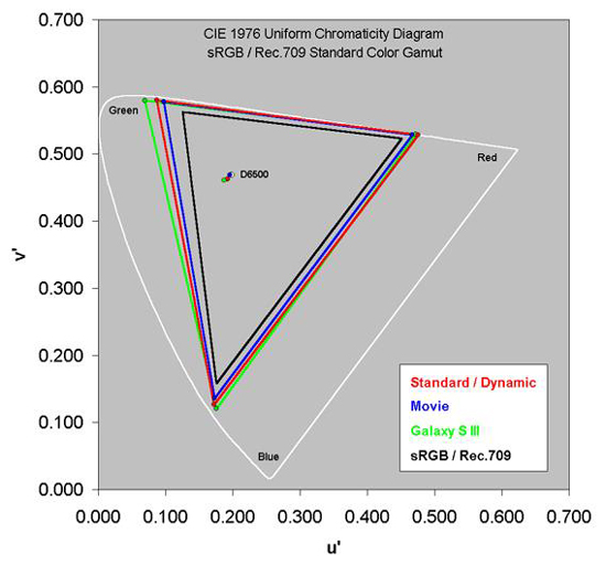 Слишком широкая цветовая гамма производит худший визуальный эффект, чем меньшая гамма. Цветовая гамма S3 на 139% превышает стандарт и отличается слишком насыщенной цветопередачей. Показатели S4: 132% в стандартном режиме и 122% в режиме видео. Охват iPhone 5 составляет 104% и по-прежнему лидирует в этом параметре, но улучшение качества S4 заметно.