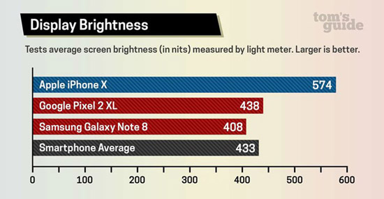 iPhone X уверенно опередил конкурентов. Яркость 5,8-дюймового экрана флагмана составляет 574 нит. У Galaxy Note8 — 408 нт, у Google Pixel 2 XL — 438 нт. Усредненное значение яркости для смартфонов с OLED-экранами от других производителей составляет 433 нт.