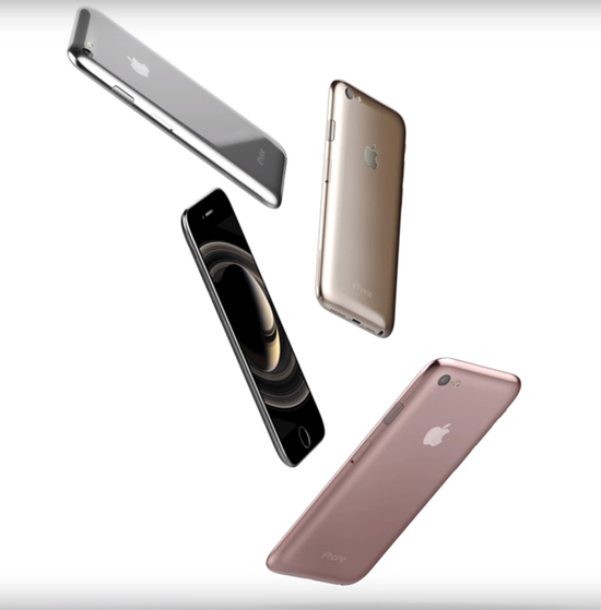 Корпус получился действительно очень тонким, однако это не стало причиной отказа от аудиоразъема, он остался на своем месте, как и сканер отпечатков пальцев Touch ID. Автор продемонстрировал четыре цветовых решения, лишь одно из которых имеет черную дисплейную рамку, в остальных случаях она белая.