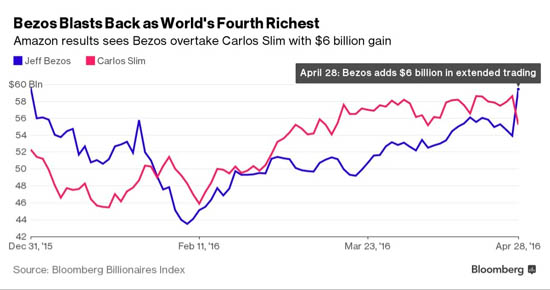Теперь в рейтинге богатейших людей мира Безос находится выше мексиканского телекоммуникационного магната Карлоса Слима, состояние которого сократилось на 3,4 млрд и составило 55 млрд долларов.