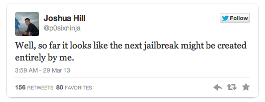 Можно подумать, что на джейлбрейке шестой прошивки можно поставить крест. Но известных хакер p0sixninja, участник Chronic Dev Team, сообщил, что обнаружил достаточно новых уязвимостей в iOS 6 для создания новой утилиты. Судя по всему в Apple обнаружили и исправили не все уязвимости, и p0sixninja нашел новые. В Twitter он написал: «Сейчас кажется, что новый джейлбрейк может быть полностью сделан мной».