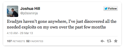 При этом хакер отметил, что evad3rs не уйдут с джейлбрейк сцены: «Evad3rs никуда не денутся. Я просто нашел за последние несколько месяцев все нужные уязвимости».