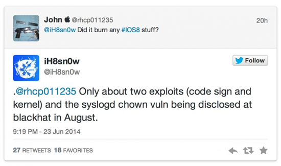 Если верить хакеру iH8sn0w, то джейлбрейк от PanguTeam раскрыл около двух уязвимостей, которые могли использоваться для взлома iOS 8. Тем не менее, сам хакер не был настроен излишне пессимистично в отношении будущего взлома iOS 8.