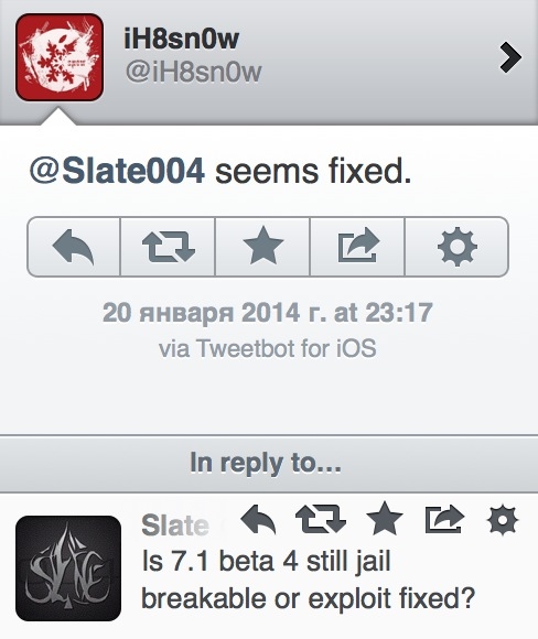 Хакеры аналогично подтверждают информацию о том, что уязвимость ядра в iOS 7.1 beta 4 была исправлена. Если вы хотите сохранить джейлбрейк, то не обновляйтесь на новую версию.