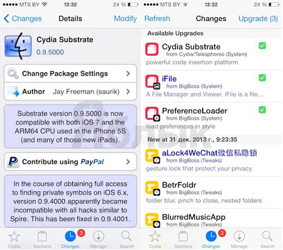 Следующим этапом необходимо обновить Mobile Substrate, для чего достаточно зайти в Cydia на iOS-устройстве и во вкладке Changes нажать экранную кнопку Refresh и установить обновление Cydia Substrate (см. скриншот выше). При этом, все твики, установленные до обновления фреймворка, сразу же начнут исправно функционировать.