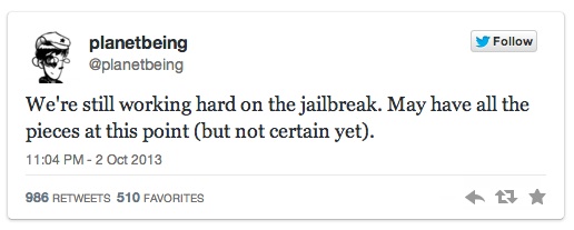Многие наши читатели, да и сам автор этих строк, относятся к джейлбрейку весьма положительно. Конечно, каждый раз, когда речь заходит о взломе устройства Apple, поднимается оживленная дискуссия на тему платежеспособности джейлбрейкеров, но в этот раз мы не будем затрагивать столь щекотливую тему. Мы спешим вам сообщить благую весть — судя по высказываниям хакера planetbeing в «Твиттере», ждать джейлбрейка для iOS 7 осталось совсем недолго.