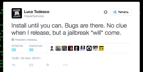 В своем микроблоге Тодеско пишет о том, что он нашел все необходимые для подготовки джейлбрейк-утилиты уязвимости и сейчас ведет разработку программы. На вопрос одного из пользователей в Twitter, почему он не подождет релиза iOS 9.1, разработчик ответил, что его «дыры» безопасности в iOS 9 закрыты.