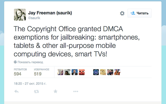 Джейлбрейк смартфонов, планшетов и других электронных устройств, включая смарт-ТВ признан законным. Об этом написал в Twitter создатель джейлбрейк-магазина Cydia Джей Фриман.