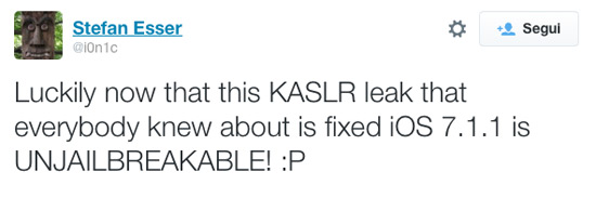 Первым, кто написал о новой прошивке, был Стефан «i0nic» Эссер – известный в джейлбрейк-среде разработчик инструментов для взлома iOS. По словам хакера, ряд уязвимостей в iOS 7.1, которые могли быть использованы для создания эксплоитов, были закрыты в последнем обновлении. Это означает, что джейлбрейк для iOS 7.1.1 не выйдет никогда, заявил i0nic.