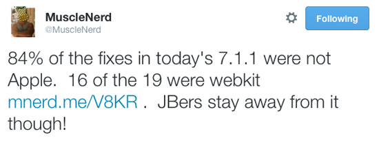 Релиз iOS 7.1.1 прокомментировал и MuscleNerd. Бывший руководитель команды iPhone Dev-Team и участник Evad3rs сообщил, что 84% исправлений в iOS 7.1.1 были сделаны не Apple. С его слов, 16 из 19 «фиксов» относятся к движку Webkit. Он рекомендовал всем, кто хочет сохранить джейлбрейк, не переходить на iOS 7.1.1.