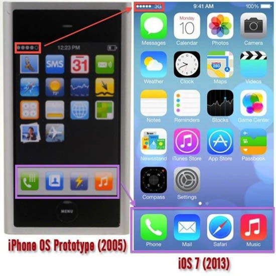 В сети раскопали ранний прототип iPhone, созданный еще в далеком 2005 году в промышленной лаборатории дизайна Джони Айва. На задней панели написано «iPod», потому что он основан на разработке старого алюминиевого iPod mini. Помните, такого «динозавра»? А теперь взгляните на интерфейс. Значки уровня сигнала сотовой сети и панель док идентичны представленным в iOS 7. Видимо, Скотт Форсталл не давал Айву внедрить этот интерфейс iOS в ранние релизы.