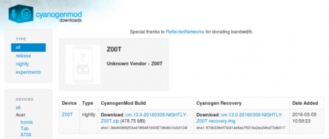 Стоит отметить, что в библиотеке CyanogenMod смартфоны значатся под кодовым названием "Z00T" с неизвестным производителем. Скачать первую "ночную" сборку можно с официального сайта проекта, а установка производится через TWRP.