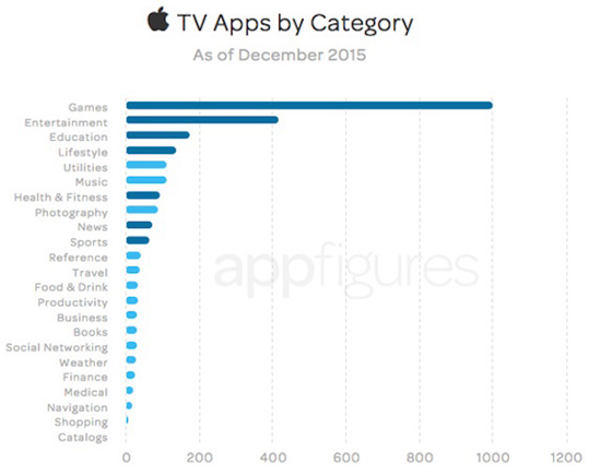 По данным AppFigures, для tvOS уже создано 2 624 игры и программы. Каждую неделю в среднем добавляется по 447 приложений, немалая часть из которых (38%) из них приходится на игры. Второе и третье места занимают категории Развлечения и Образование соответственно.