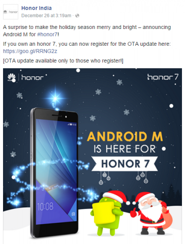 Компания Huawei сделала подарок своим фанатам в честь новогодних праздников, выпустив для Honor 7 обновление до Android 6.0 Marshmallow. Однако для того, чтобы получить OTA-обновление, необходимо заполнить специальную форму, указав нынешнюю версию прошивки, контактный номер, адрес электронной почты и IMEI смартфона. После регистрации вам "по воздуху" будет доступно обновление до EMUI 4.0 на базе Android 6.0. На данный момент это только бета-версия, а стабильная сборка будет доступна в течение ближайших нескольких недель.