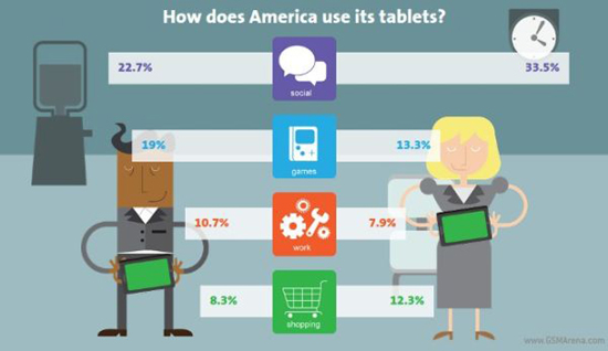Исследование об использовании «таблеток» было проведено на жителях США. Выяснилось, что для работы планшет используют примерно 10,7% мужчин и всего 7,9% женщин. Куда больше планшетом пользуются с целью развлечения. Так, для игр «таблетки» используют 19% мужчин и 13,3% всех женщин. Что касается общения в чатах и социальных сетях, то здесь предсказуемо доминируют женщины, которые используют планшет для общения в 33% случаев. И лишь 22,7% всех мужчин общаются с помощью планшета. Последний показатель – это использование мобильного ПК при совершении покупок в магазине. Это самый непопулярный способ использования планшета, применяемый 12,3% женщинами и 8,3% мужчин. И напоследок еще несколько интересных фактов: 41,7% всех американцев в первой половине дня предпочитают использование планшета вместо живого общения, а мужчины более склонны к использованию планшетов в ванной.