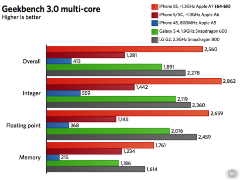 В качестве примера можно привести iPhone 5S, в котором ее использование, согласно данным бенчмарков, дает 30-% (а по некоторым тестам, даже большее) улучшение по сравнению с ARMv7 на одном и том же оборудовании.