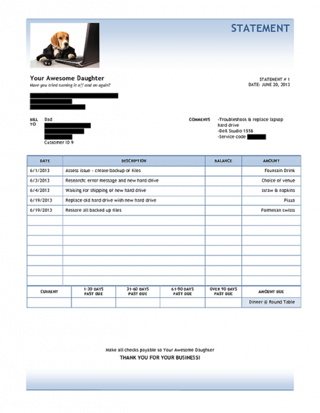 Девочка взяла и выставили отцу счет, причем даже составила под это дело специальный бланк, на котором вместо слогана приведена легендарная фраза «А Вы пробовали перезагрузить компьютер?», намекающая на самый простой способ ремонта электроники. Далее перечислены даты и описание работ, а также положенные за них вознаграждения. К примеру, за создание резервных копий файлов девочка требует газировку, за замену жесткого диска – пиццу.