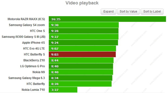 В тесте с воспроизведение HD-видео HTC Butterfly s также показал себя неплохо — 9 часов 3 минуты. Это средний результат, близкий к показателям большинства других Android-смартфонов высокого класса. По всей видимости, огромную емкость аккумулятора «съел» большой экран с высоким разрешением.