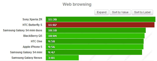 Следующий тест должен быть достаточно сложным для смартфона с большим экраном — веб-браузинг. Но на удивление — новинка прекрасно прошла его, отработав в этом режиме 11 часов 7 минут. Этот показатель лишь немного уступает лидеру, Xperia ZR от Sony. Впрочем, у него и диагональ дисплея составляет лишь 4.5 дюйма.