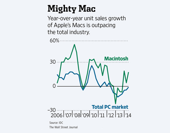 Ажиотаж, связанный с презентацией новых смартфонов iPhone и планшетов iPad, сделал менее заметной другую важную тенденцию – Apple возвращает себе долю рынка персональных компьютеров. В течение квартала, который завершился 27 сентября, корпорация реализовала 5,5 млн компьютеров Mac. Доля Apple на рынке ПК превысила 6% и достигла максимального уровня с 1995 года, когда Microsoft стала доминирующим игроком с выходом операционной системы Windows 95. В 2006 году продажи компьютеров на операционной системе Mac OS X в мире составляли всего 2,1%, с того момента их доля на рынке росла в 33 из 34 кварталов.