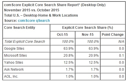 Компания Microsoft продолжает увеличивать своё влияние на рынке поисковых систем. По последним статистическим данным, поисковик Bing продолжает планомерно увеличивать свою пользовательскую базу, тогда как у Google наблюдается небольшое сокращение. Специалисты сервиса comScore опубликовали информацию по поисковым запросам за ноябрь 2015 года в разбивке по поисковым сервисам. Данные актуальны по отношению к рынку Соединённый Штатов Америки. Так, рост числа обращений наблюдается только у Bing (с 20,8 % до 20,9 %), тогда как у Google и Yahoo всё осталось без изменений (63,9 % и 12,5 % соответственно).