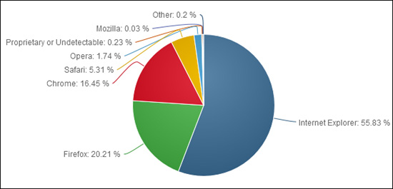 Самая распространённая версия веб-обозревателя компании Microsoft — Internet Explorer 8, у которой 23,23%. Доля Internet Explorer 9 в прошлом месяце равнялась 20,62%. Браузер Internet Explorer 10, начав месяц с 1,58%, закончил его с долей в 2,93%, что объясняется прежде всего выходом версии продукта для операционной системы Windows 7.
