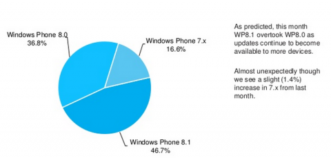 Согласно новым данным от исследовательской компании AdDuplex, количество устройств с операционной системой Windows Phone 8.1 превысило число аппаратов на Windows Phone 8, и теперь их доля составляет 46,7 % и 36,8 % соответственно. Напомним, что месяц назад доля Windows Phone 8.1 не превышала 39,1 %. Стоит отметить, что достаточно необычным выглядит увеличение количества устройств, работающих на Windows Phone 7, доля которых теперь составляет 16,6 %.