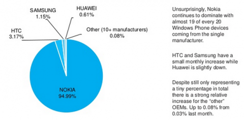 Среди всех производителей смартфонов на базе операционной системы Windows Phone лидером по-прежнему остаётся Nokia с долей рынка 95 %. Интересно, что доля рынка малоизвестных производителей увеличилась за прошедший месяц с 0,03 % до 0,08 %.