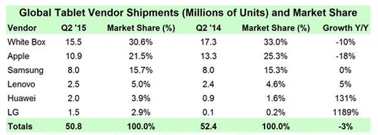 Среди производителей пальму первенства по-прежнему удерживает Apple, однако компания продолжает сдавать позиции. В прошлой четверти американская корпорация отгрузила 10,9 млн iPad (−18 % ко второму кварталу 2014-го), что в объёме мирового рынка соответствует 21,5 %.