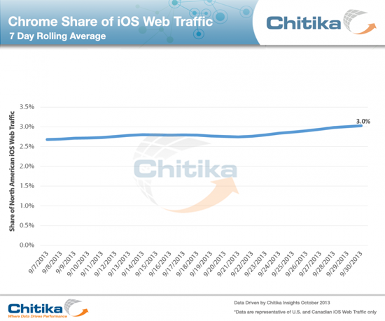 За последний год доля браузера Chrome для iOS увеличилась в два раза и теперь составляет 3%, сообщают аналитики одного из крупнейших рекламных агентств Chitika. Результаты исследования от Chitika основаны на данных о веб-трафике миллионов жителей США и позволяют в полной мере оценить востребованность браузера Chrome.