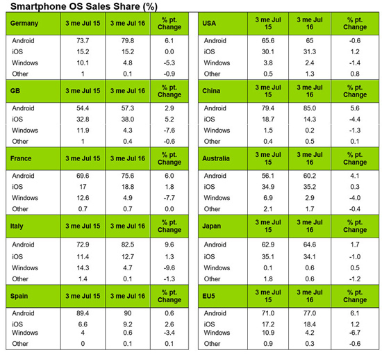 Android тем временем также укрепляет свои позиции на рынке Европы. За год продажи Android-смартфонов выросли в Германии, Великобритании и Франции – на 6,1%, 2,9% и 6,0% соответственно.