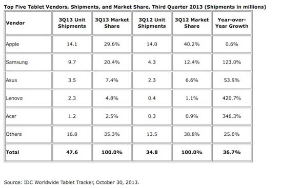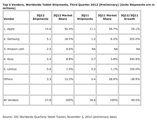 В первоначальной статистике доля iPad была оценена в 50,4% от всех отгрузок планшетов в третьем квартале 2012 года. В новом варианте этот показатель был оценен всего в 40,2%. Кроме того, что конкуренты Apple получили 10 млн неучтенных ранее планшетов на свой счет, квартальные показатели Samsung и Asus были снижены на 1 млн.