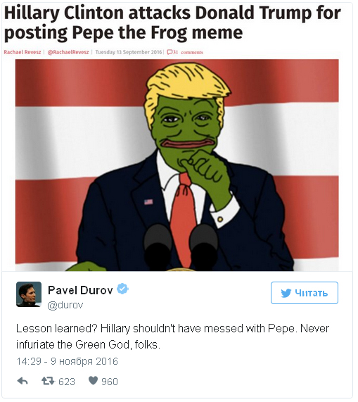 Основатель соцсети «ВКонтакте» и мессенджера Telegram Павел Дуров связал поражение демократа Хиллари Клинтон на президентских выборах в США с критикой мема о лягушонке Пепе. Об этом он написал в своем Twitter.