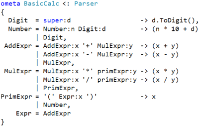 В этой системе есть высокоуровневые языки OMeta и Nile, синтаксис которых смахивает на С и Python соответственно. Программы на них в конечном итоге транслируются в программы на низкоуровневом языке Nothing. Вот пример на OMeta: синтаксис калькулятора: