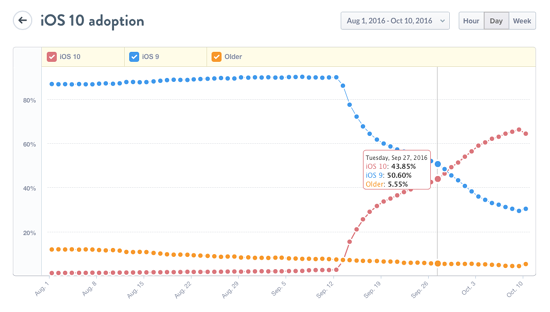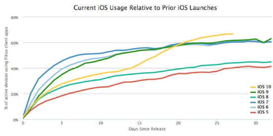 iOS 10 опередила по количеству работающих под её управлением устройств еще на прошлой неделе. Как отмечают аналитики, «десятке» удалось побить рекорд по скорости распространения все предыдущие версии ОС. Причем на начальном этапе скорость адаптации iOS 10 была ниже, чем у предыдущих версий ОС. Однако к концу третьей недели она резко вырвалась вперед обойдя iOS 6, iOS 7, iOS 8 и iOS 9. Аналитики не исключают, что свою роль сыграли успешные продажи смартфонов iPhone 7 и iPhone 7 Plus.