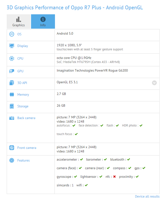 Прочие характеристики включают восьмиядерный процессор MediaTek MT6795 с частотой 1,9 ГГц, 3 ГБ оперативной памяти, 32 ГБ внутреннего накопителя, а также Android 5.0 в качестве операционной системы. Интересно, что в качестве основной и фронтальной камеры используются модули с одинаковым разрешением - 7 Мп. Не исключено, что сведения о камере являются некорректными - порой GFXBench отображает неверную информацию, что признают даже владельцы сервиса.