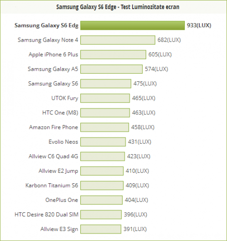 Высокая яркость экрана означает хорошую видимость изображения на экране под прямыми солнечными лучами. Samsung Galaxy S6 Edge обладает колоссальным для смартфона запасом яркости и обходит по этому показателю все известные устройства, оставив позади даже Samsung Galaxy Note 4 и Apple iPhone 6 Plus.