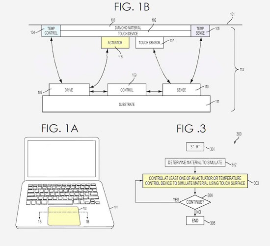 В патенте под названием «Сенсорная поверхность для имитации материалов» (Touch Surface for Simulating Materials) акцент сделан на системе тактильной обратной связи. При ее использовании топология и температура поверхности прямо под пальцем изменяется, имитируя текстуры и края объектов. Благодаря технологии поверхность сенсорного экрана iPad или тачпада MacBook на ощупь сможет казаться, например, холодным металлом или теплой цементной поверхностью.