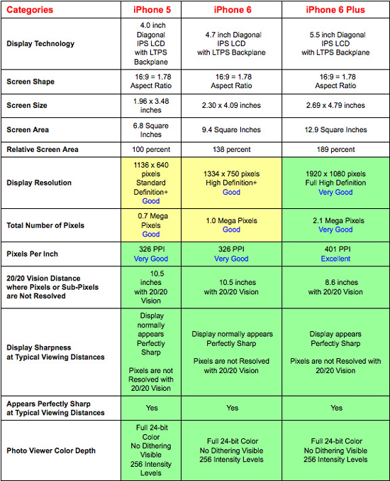 Специалисты DisplayMate провели комплексное тестирование дисплеев новых смартфонов iPhone 6 и iPhone 6 Plus. Результаты исследования для наглядности были помещены в таблицу. Эксперты, с 2006 года занимающиеся тестированием и оценкой разнообразных экранов, утверждают, что 5,5-дюймовый телефон Apple обладает лучшим дисплеем из всех, что когда-либо попадали им на тесты.