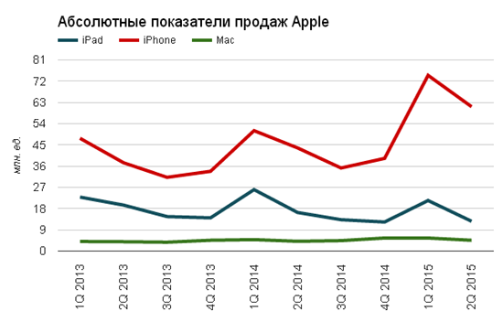 Ядром успеха Apple на протяжении долгого времени является iPhone. Если просто посмотреть на динамику продаж единиц продукции Apple, лидер очевиден: